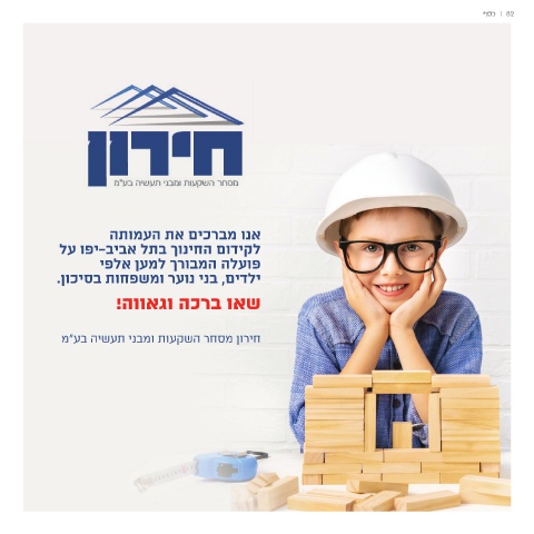 | 82כסף אנו מברכים את העמותה לקידום החינוך בתל אביב-יפו על פועלה המבורך למען אלפי ילדים ,בני נוער ומשפחות בסיכון. שאו ברכה וגאווה! חירון מסחר השקעות ומבני תעשיה בע"מ