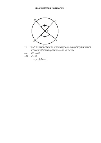 เฉลย ใบกิจกรรม ส่วนโค้งที่เท่ากัน 1 จาก ทฤษฎี ในวงกลมที่เท่ากันทุกประการหรือในวงกลมเดียวกันถ้ามุมที่จุดศูนย์กลางมีขนาด เท่ากันแล้วส่วนโค้งที่รองรับมุมที่จุดศูนย์กลางนั้นจะยาวเท่ากัน และ DOC = AOB จะได้ DC = AB = 20 เซ็นติเมตร