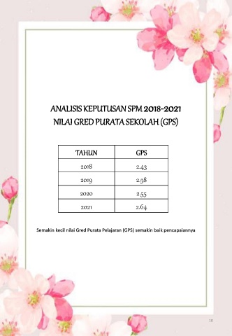ANALISIS KEPUTUSAN SPM 2018-2021 NILAI GRED PURATA SEKOLAH (GPS) TAHUN GPS 2018 2.43 2019 2.58 2020 2.55 2021 2.64 Semakin kecil nilai Gred Purata Pelajaran (GPS) semakin baik pencapaiannya 18