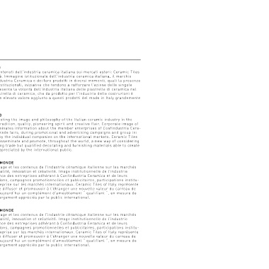 foreign markets. Ceramic Tiles of Italy sums up the industry’s tradition, quality, pioneering spirit and creative flair. Corporate image of