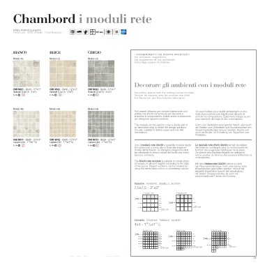 60x120 - 60x90 - 30x90 - 60x60 - 20x60 CHB P613 - 60x120 Lappato Rettificato 65 CHB R693 - 60x90 Naturale Rettificato R 9 60 CHB P393 - 30x90 Lappato Rettificato 65 Lappato (4x4 - 1” /2x1” /2) Pz. Box 4 Pz. Box 4 Con il modulo rete 30x30 è possibile ricavare fascie Le module rete (filet) 30x30 permet de réaliser