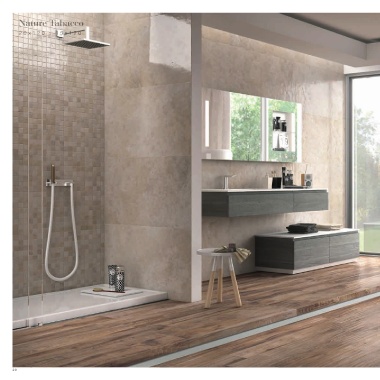Pavimento . Floor: Nature Tabacco Tabacco 20x120 . 15x120 . Gradino Costa Retta 33x120 Rivestimento . Wall tile: 20x120 . 15x120 Collection “Chambord” Beige 60x120 . Modulo rete 30x30 20 21