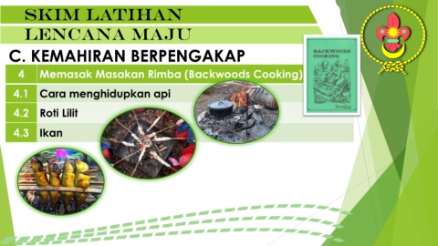Skim latihan lencana maju C. KEMAHIRAN BERPENGAKAP 4 Memasak Masakan Rimba (Backwoods Cooking) 4.1 Cara menghidupkan api 4.2 Roti Lilit 4.3 Ikan