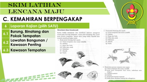 Skim latihan lencana maju C. KEMAHIRAN BERPENGAKAP 6 Laporan Kajian (pilih SATU) Burung, Binatang dan 6.1 Pokok Tempatan Lawatan Bangunan / 6.2 Kawasan Penting 6.3 Kawasan Tempatan