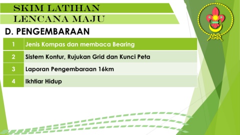 Skim latihan lencana maju D. PENGEMBARAAN 1 Jenis Kompas dan membaca Bearing 2 Sistem Kontur, Rujukan Grid dan Kunci Peta 3 Laporan Pengembaraan 16km 4 Ikhtiar Hidup