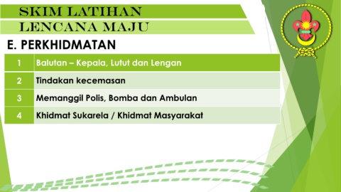 Skim latihan lencana maju E. PERKHIDMATAN 1 Balutan – Kepala, Lutut dan Lengan 2 Tindakan kecemasan 3 Memanggil Polis, Bomba dan Ambulan 4 Khidmat Sukarela / Khidmat Masyarakat