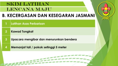Skim latihan lencana maju B. KECERGASAN DAN KESEGARAN JASMANI 1 Latihan Asas Perbarisan 2 Kawad Tongkat 3 Upacara mengibar dan menurunkan bendera 4 Memanjat tali / pokok setinggi 5 meter