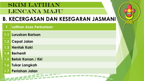 Skim latihan lencana maju B. KECERGASAN DAN KESEGARAN JASMANI 1 Latihan Asas Perbarisan 1.1 Luruskan Barisan 1.2 Cepat Jalan 1.3 Hentak Kaki 1.4 Berhenti 1.5 Belok Kanan / Kiri 1.6 Tukar Langkah 1.7 Perlahan Jalan