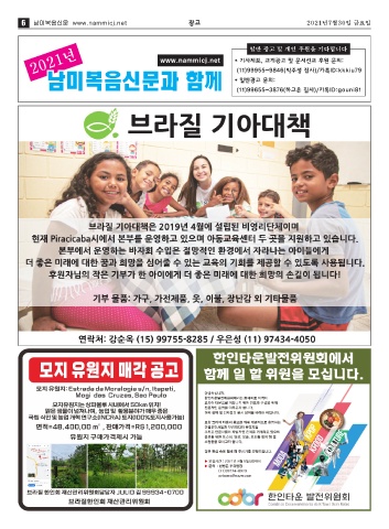 6 남미복음신문 www.nammicj.net 광고 2021년7월30일 금요일 일반 광고 및 개인 후원을 기다립니다 2021년 www.nammicj.net * 기사제보, 교계광고 및 문서선교 후원 문의: (11)99955-9846(박주성 집사)/카톡ID:kkkiu79 남미복음신문과 함께 * 일반광고 문의: (11)99655-3876(하고은 집사)/카톡ID:gouni81