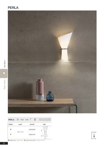 PERLA Wall Lamps Apliques PERLA IP20 IK00 Double Layer Glass/Metal Cristal Doble Capa/Metal FINISH LAMP ON-OFF SIZE A30201OP 415 2xE27 LED LED BULBS A30201OT 110 230 Pag. 388 Opal/Chrome - Opal/Cromo Opal/Technical Gold - Opal/Oro Técnico 22