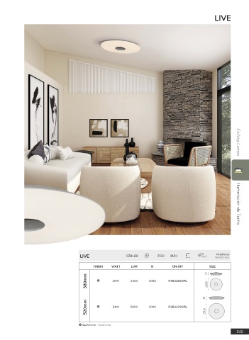 LIVE Metal/Glass LIVE CRI>80 IP20 IK01 incl Metal/Cristal Ceiling Lamps Iluminación de Techo FINISH WATT LUM K ON-OFF SIZE 75 380mm 28W 2550 3000 P363150OPL 380 85 520mm 54W 5000 3000 P363170OPL 520 Opal/Chrome - Opal/Cromo 245