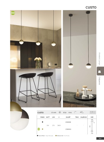 CUSTO Metal/Acrylic CUSTO CRI>80 IP20 IK04 incl Metal/Acrílico Pendant Lamps Colgantes FINISH WATT LUM K ON-OFF TRIAC DALI/PUSH SIZE 80 C38181N 35 5W 370 3000 - - 1800 C38181O 94 Textured Black - Negro Texturado Technical Gold - Oro Técnico 267