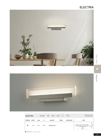 ELECTRA ELECTRA CRI>80 IP20 IK05 incl Metal/Methacrylate Wall Lamps Apliques Metal/Metacrilato FINISH WATT LUM K ON-OFF TRIAC DALI/PUSH SIZE 55 12W 1000 3000 A362510NS - - 90 50 200 35 400 Satin Nickel - Níquel Satinado 27