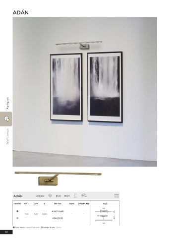 ADÁN Wall Lamps Apliques ADÁN CRI>80 IP20 IK04 incl Metal Metal FINISH WATT LUM K ON-OFF TRIAC DALI/PUSH SIZE 100 A341310NS 45 6W 530 3000 - - 30 A341310U 210 455 Satin Nickel - Níquel Satinado Antique Brass - Cuero 32