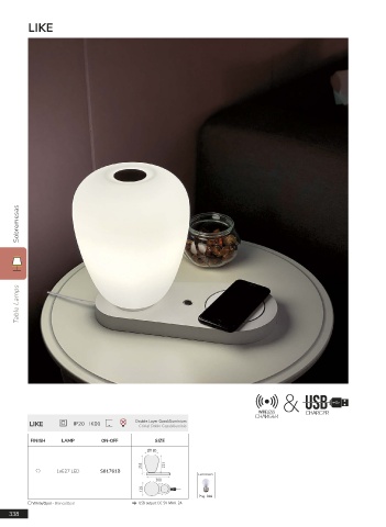 LIKE Sobremesas Table Lamps LIKE IP20 IK00 Double Layer Gass/Aluminium Cristal Doble Capa/Aluminio FINISH LAMP ON-OFF SIZE Ø180 253 225 1xE27 LED S81761B LED BULBS 300 139 Pag. 388 White/Opal - Blanco/Opal USB output: DC 5V-MAX. 2A 338