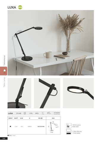 LUXA Sobremesas Table Lamps LUXA CRI>80 IP20 IK03 incl Acrílico/Meta Acrylic/Metal FINISH WATT LUM K ON-OFF SIZE 360 TOUCH control 11W 700 3000K S8203000N 500 Ø120 Botón táctil 3 Steps dimming Ø190 3 Intensidades Black - Negro 344
