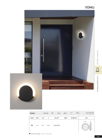 YOMU YOMU CRI>80 IP54 IK07 incl Aluminium/Acrylic Outdoor Lighting Iluminación Exterior Aluminio/Acrílico FINISH WATT LUM K ON-OFF TRIAC DALI/PUSH SIZE 165 40 11W 800 3000 A202310N - - Textured Black/Opal - Negro Texturado/Opal 351