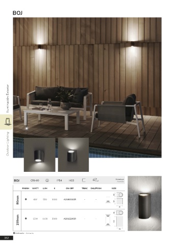 BOJ Outdoor Lighting Iluminación Exterior BOJ CRI>80 IP54 IK03 incl Aluminium Aluminio FINISH WATT LUM K ON-OFF TRIAC DALI/PUSH SIZE 68 80mm 6W 550 3000 A204010GR - - 80 90 68 150mm 12W 1100 3000 A201520GR - - 150 90 Anthracite - Antracita 352