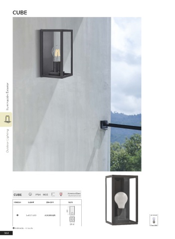 CUBE Outdoor Lighting Iluminación Exterior CUBE IP54 IK02 Aluminium/Glass Aluminio/Cristal FINISH LAMP ON-OFF SIZE 222 1xE27 LED A20391GR LED BULBS 120 Pag. 388 Anthracite - Antracita 364