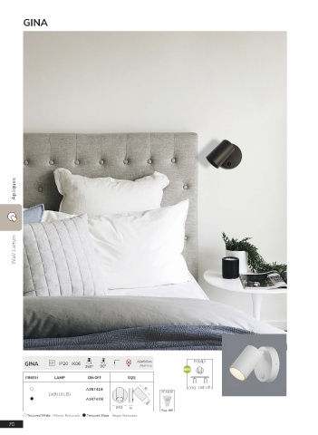 GINA Wall Lamps Apliques GINA IP20 IK06 Aluminium FAMILY 350º 90º Aluminio FINISH LAMP ON-OFF SIZE A38741B 90 pag. 144-145 1xGU10 LED LED BULBS A38741N Ø57 Ø105 26 Pag. 388 Textured White - Blanco Texturado Textured Black - Negro Texturado 70