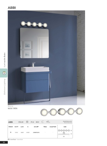 ABBI Bathroom Lighting Iluminación Baño Design by NACHO TIMÓN ABBI CRI>80 IP44 IK02 incl Metal/Methacrylate Metal/Metacrilato FINISH WATT LUM K ON-OFF TRIAC DALI/PUSH SIZE 86 20W 1600 3000 A380010C - - Ø80 45 540 Chrome/Opal - Cromo/Opal 84