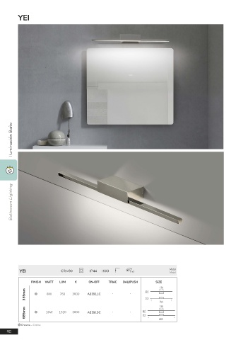 YEI Bathroom Lighting Iluminación Baño YEI CRI>80 IP44 IK03 incl Metal Metal FINISH WATT LUM K ON-OFF TRIAC DALI/PUSH SIZE 130 355mm 8W 760 3000 A33911C - - 80 35 355 130 685mm 16W 1520 3000 A33913C - - 80 35 685 Chrome - Cromo 90