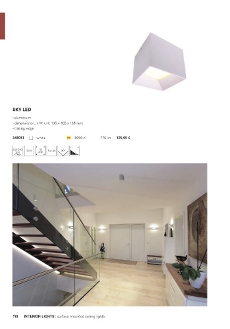 SKY LED aluminium dimensions L x W x H: 105 x 105 x 105 mm trailing edge 348013 white WW 3000 K 770 lm 125,95 € 220-240 18 10 W LED Ra>80 90° 110 INTERIOR LIGHTS | surface mounted ceiling lights