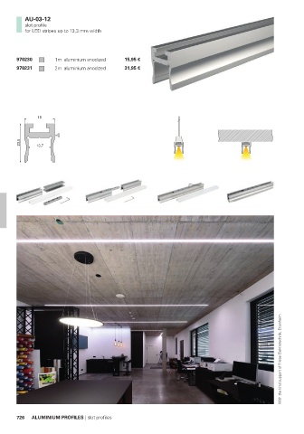 AU-03-12 slot profile for LED stripes up to 13,3 mm width 970230 1m aluminium anodized 15,95 € 970231 2m aluminium anodized 31,95 € 18 3 23,5 13,7 With the kind support of Friese Elektrotechnik, Ettenheim 726 ALUMINIUM PROFILES | slot profiles