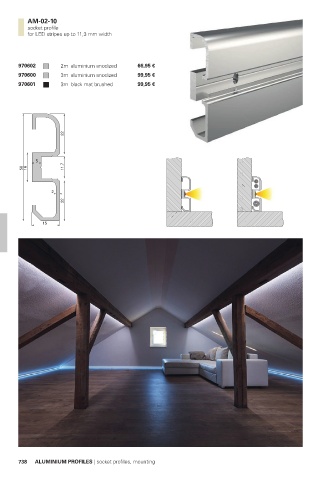 AM-02-10 socket profile for LED stripes up to 11,3 mm width 970602 2m aluminium anodized 66,95 € 970600 3m aluminium anodized 99,95 € 970601 3m black mat brushed 99,95 € 22 5 58 16 11,7 2 22 15 738 ALUMINIUM PROFILES | socket profiles, mounting