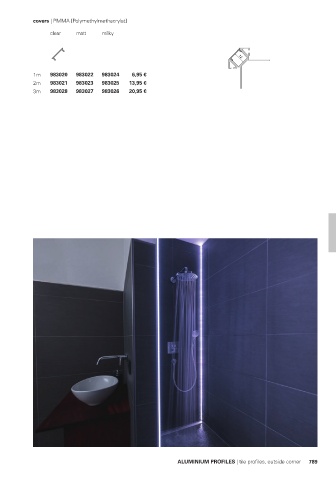 covers | PMMA [Polymethylmethacrylat] clear matt milky 12 1m 983020 983022 983024 6,95 € 2m 983021 983023 983025 13,95 € 3m 983028 983027 983026 20,95 € ALUMINIUM PROFILES | tile profiles, outside corner 789 ALUMINIUMPROFILE | <Produktart>