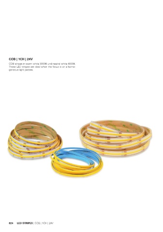 COB | 1CH | 24V COB stripes in warm white 3000K und neutral white 4000K These LED stripes are ideal when the focus is on a homo- geneous light pattern. 824 LED STRIPES | COB | 1CH | 24V