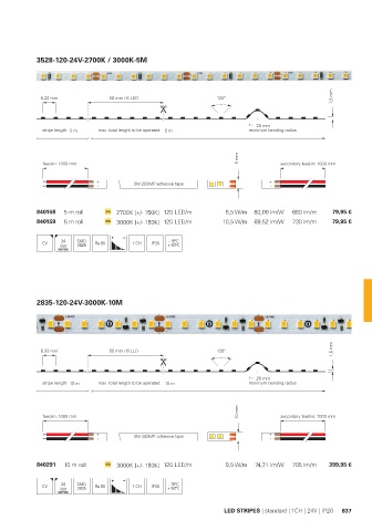 840291 10 m roll 3000K [+/- 150K] 120 LED/m 9,5 W/m 74,21 lm/W 705 lm/m 399,95 €