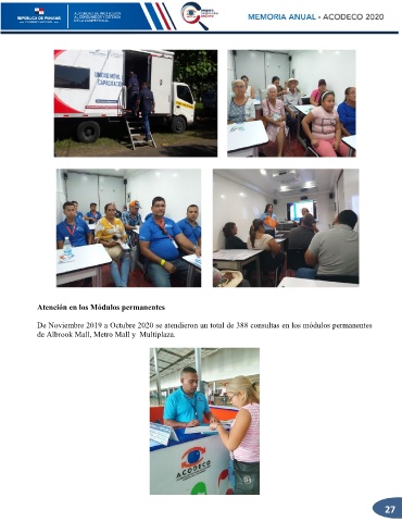 Atención en los Módulos permanentes De Noviembre 2019 a Octubre 2020 se atendieron un total de 388 consultas en los módulos permanentes de Albrook Mall, Metro Mall y Multiplaza. 27