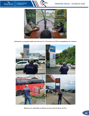 Orientación en programa radial sobre Decreto No. 114 de marzo de 2020 e incumplimiento de contratos Monitoreo de combustible en distritos de la provincia de Bocas del Toro 85