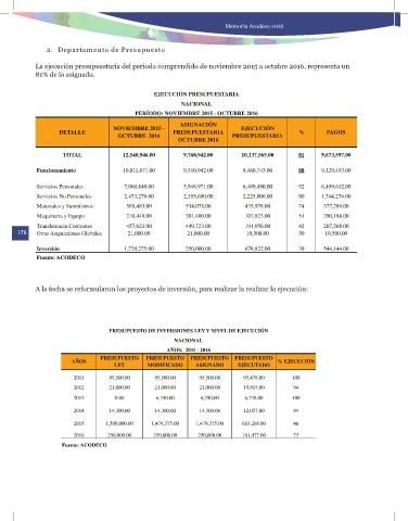 La ejecución presupuestaria del período comprendido de noviembre 2015 a octubre 2016, representa un