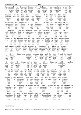 [ ἐν 7 τοῖς 8 οὐρανοῖς 9 καὶ 10 ἐπὶ 11 τῆς 12 γῆς 13 ] ἐκτίσθη 4 ἐν 2 αὐτῷ 3 τὰ 14 ὁρατὰ 15