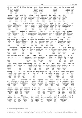ἐποίησεν 6 πηλὸν 7 ἐκ 8 τοῦ 9 πτύσματος 10 καὶ 11 ἐπέχρισεν 12 τὸν 14 πηλὸν 15 ἐπὶ 16 αὐτοῦ 13