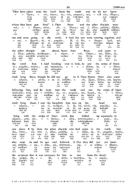 ἀκολουθῶν 6 αὐτῷ 7 καὶ 8 ] εἰσῆλθεν 9 εἰς 10 τὸ 11 μνημεῖον 12 καὶ 13 θεωρεῖ 14 τὰ 15 ] ] ὀθόνια 16
