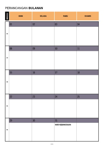 PERANCANGAN BULANAN MINGGU ISNIN SELASA RABU KHAMIS 01 02 03 04 32 08 09 10 11 33 15 16 17 18 34 22 23 24 25 35 29 30 31 HARI KEBANGSAAN 36 373