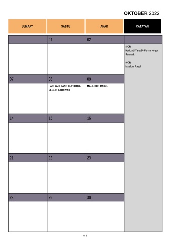 OKTOBER 2022 JUMAAT SABTU AHAD CATATAN 01 02 8 Okt Hari Jadi Yang Di-Pertua Negeri Sarawak 9 Okt Maulidur Rasul 07 08 09 HARI JADI YANG DI-PERTUA MAULIDUR RASUL NEGERI SARAWAK 14 15 16 21 22 23 28 29 30 378