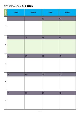 PERANCANGAN BULANAN MINGGU ISNIN SELASA RABU KHAMIS 01 02 6 06 07 08 09 7 13 14 15 16 8 20 211 22 23 9 27 28 29 30 10 387