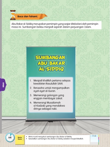 68 Nota • Minta murid menyebut sumbangan Abu Bakar al-Siddiq. 7.1.3