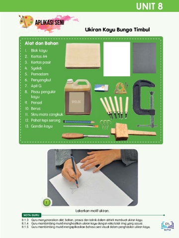8.1.1 Guru menyatakan definisi ukiran. 8.1.5 Guru membimbing murid mengaplikasikan bahasa seni visual dalam penghasilan ukiran kayu.