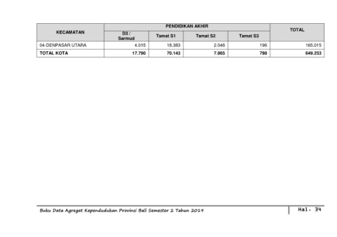 PENDIDIKAN AKHIR KECAMATAN D3 / TOTAL Sarmud Tamat S1 Tamat S2 Tamat S3 04-DENPASAR UTARA 4.015 18.383 2.046 196 165.015 TOTAL KOTA 17.790 70.143 7.865 798 649.253 Buku Data Agregat Kependudukan Provinsi Bali Semester 2 Tahun 2019 Hal. 34