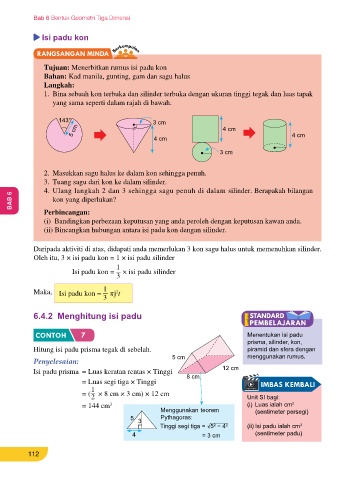Bahan: Kad manila, gunting, gam dan sagu halus Isi padu silinder = Luas keratan rentas × Tinggi 7 cm t