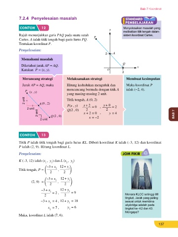 Hitung koordinat titik tengah bagi garis lurus AB dengan A(2, 5) dan B(2, 1). CONTOH 12 y Menyelesaikan masalah yang