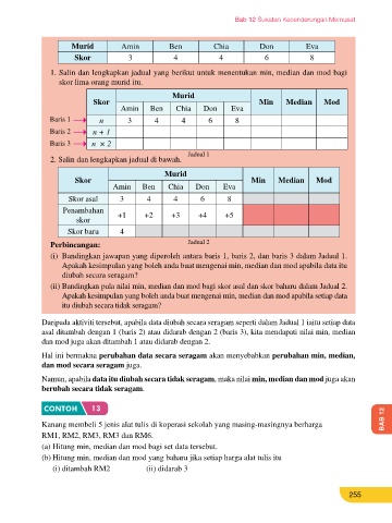 12.1.2 Kesan perubahan suatu set data terhadap Hal ini bermakna perubahan data secara seragam akan menyebabkan perubahan min, median,