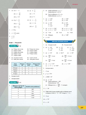 (e) 6v + v – 2 (f) 13h – 10hk + k 2 (g) Poligon sekata (h) Poligon sekata 3. (a) x = 50° (b) x = 42.5° (c) x = 80°