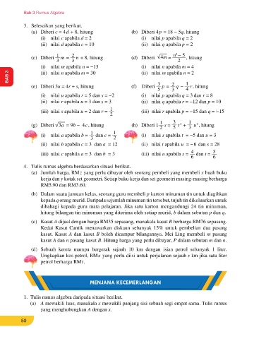 (a) Diberi c = 4d + 8, hitung (b) Diberi 4p = 18 − 5q, hitung Bayaran bagi setiap jam yang berikutnya ialah RM3. Tulis rumus yang menghubungkan