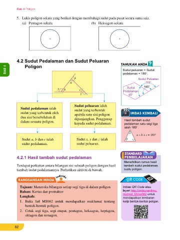 4.2.1 Hasil tambah sudut pedalaman Hasil tambah sudut pedalaman suatu poligon = (n – 2) × 180°.